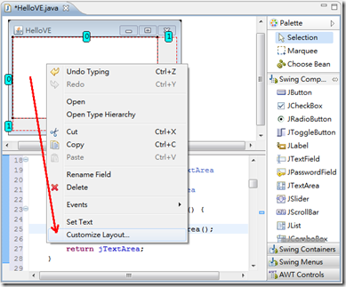 調整元件細部設定,讓畫面協調一些,點選 JTextArea 元件,按滑鼠右鍵選擇 Customize Layout...。