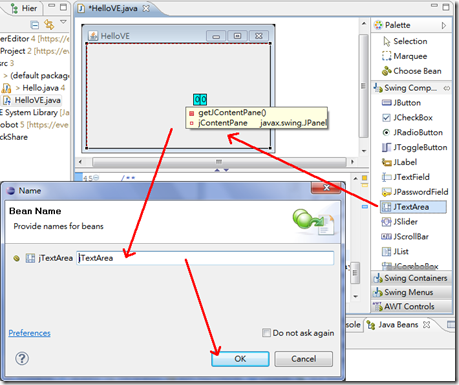 點選 JTextArea 後(滑鼠左鍵要放掉,不是拖曳喔)將滑鼠移到 JFrame 畫面上,於 Layout 0|0 位置點選滑鼠,將文字區域元件放置到視窗內,接著在彈出訊息框決定元件名稱,按下 [OK] 按鈕。