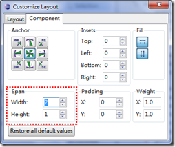 一樣點選 JTextField 元件,按滑鼠右鍵選擇 Customize Layout...,點選 Fill 橫向擴展按鈕(←→),讓元件填滿整個單位。