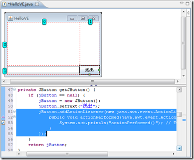 VE 會在程式碼區自動產生一段 JButton 事件監聽的程式碼。
