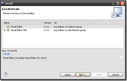 點開 "田" 選擇細項,勾選 Visual Editor 與 SDK,按 [Next] 安裝。(未安裝 EMF 需勾選 Java EMF Model)