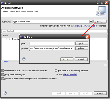 開啟安裝視窗後,1. 按 [Add] 按鈕 2. Location 填入更新網址(這裡查詢) 3. 按 [OK] 按鈕