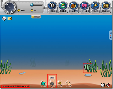 當魚隻發青,左下角也會顯示文字訊息,這時候就要餵魚。