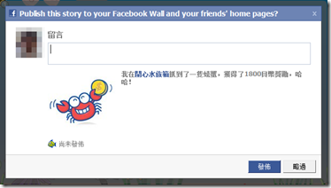 第一次玩會跳出發佈畫面,可以選擇發佈到塗鴉牆,告訴親朋好友你開始玩了。