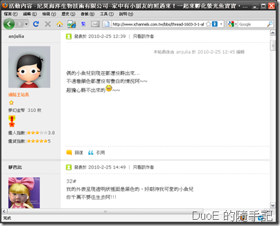 | 三 | 2010/02/22(一) | 10 天了,應該要孵出來了,可是完全沒動靜,還是去論壇問問狀況。 |