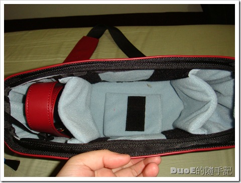 包包裡面,除了標準放相機的隔層,旁邊那條紅色的皮帶可不是包包的背帶喔,那是包包附贈的相機專用背帶,所以這次買相機除了FZ35的機身專用背帶,還多了一條G1用的帶子,老爺一直催促我把帶子換成這條,可是就覺得整組黑才好看,這條就留著備用,等黑色的相機帶壞了,再把這條換上,雖然這條比較堅固耐用,目前還是收著先。