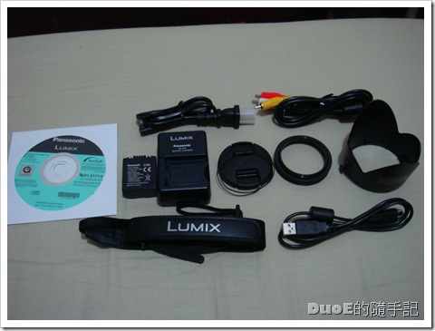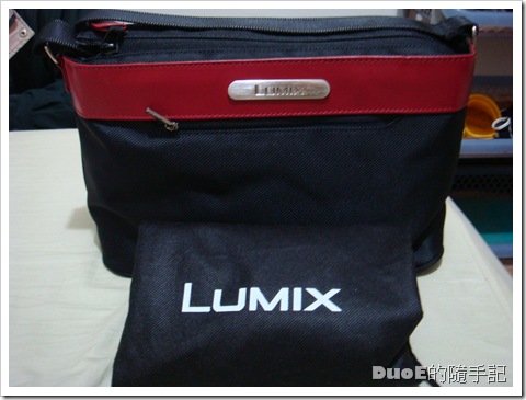除了有輕巧的相機,兩個常用鏡頭,還有廠商送的相機清潔組和8G的記憶卡,記憶卡還是 SanDisk 的 Class4 不算太小氣,這原廠相機包也是很值得拿出來說嘴的。本來我們以為所謂的原廠相機包是一般那種四四方方的布面包,上面掛個 Panasonic 的鐵牌,而且一開箱還想,沒事幹嘛送個鞋盒給我們,仔細看了一下,上面印著大大的 G1,ㄟ......該不會他送的是G1包吧!?