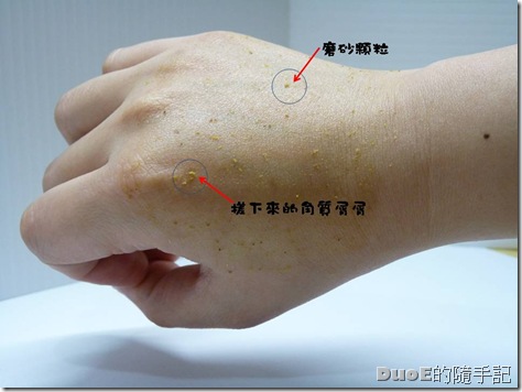 在手背上按摩推勻之後就像這樣,顏色較深的是凝膠裡的按摩顆粒,細細白白的點點就是搓下來的角質屑。