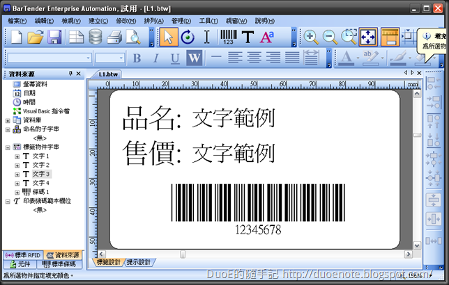 接者打開 BarTender 建立一張簡單的標籤,這裡做一張兩個文字一個條碼的標籤。