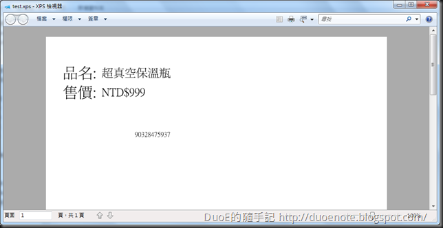 執行程式結果(這裡用 XPS 代替印表機,故條碼無法列印。)
