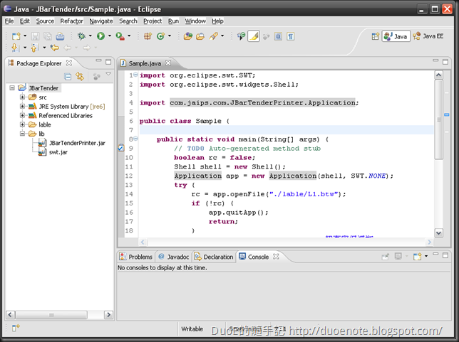 這邊做個簡單的 Sample,開啟 eclipse 建立一個 Java Project,加入 swt.jat 以及 JBarTenderPrinter.jar 兩個 Library,最後建立一個 Class 名為 Sample 並包含 main method。
