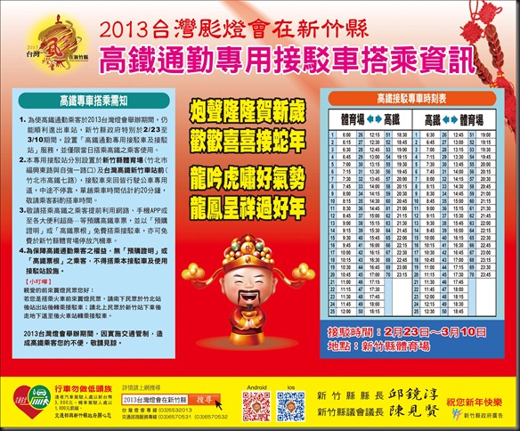 (2) 2013台灣燈會在新竹縣的日期是2/24日到3/10日,長達15天的嘉年華會,高鐵將加班加強運輸,加班時段、末班車時間、如何轉乘等措施如下: