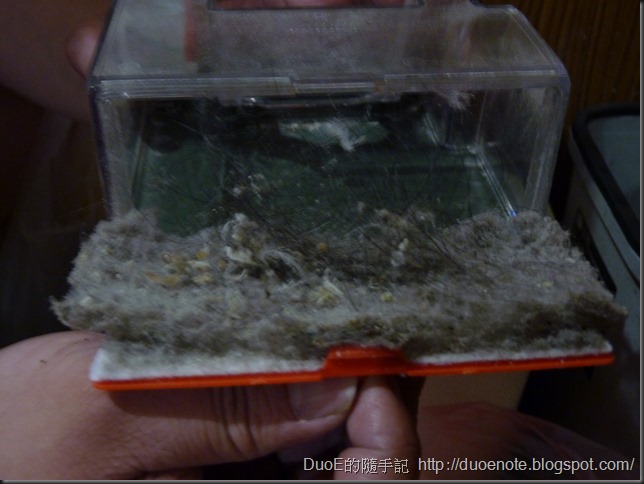 在蘿蔔頭跟床墊奮戰過後,集塵盒出現這般恐怖模樣,夭壽喔,那厚厚的一層,每天睡覺的床墊竟然架泥胎割......