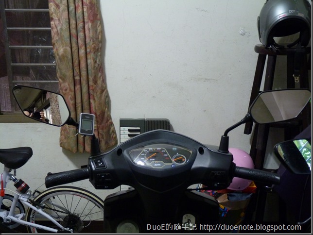 因為儀表板上沒得黏,發現後照鏡是個不錯的地方,橋好要裝的位子,就開始動工把GPS定位器安上去。先把束帶穿過機器架子上的洞,接著把附的橡膠墊片捲在後照鏡的支架上,把主機架擺上去,束帶拉緊,就大功告成啦。架子墊著橡膠墊一起綁緊,可以避免主機沒辦法固定在後照鏡架上而滑動,所以千萬不能忘記把橡膠墊片給綁上。