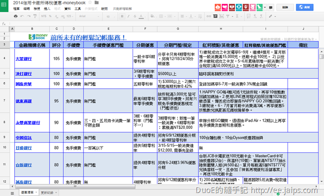 信用卡繳費各家銀行也推出分期0利率、紅利積點、抽獎…等各種優惠,網路上已經有整理好的比較,還有依據優惠內容評分,相當的實用方便,信用卡所得稅繳稅優惠一覽表:2014信用卡繳所得稅優惠-moneybook - Google 試算表