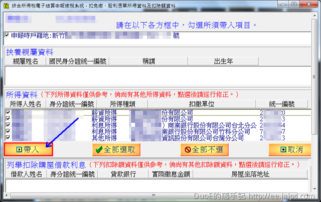 右上角的總表就是今年的所得稅資料,紅色字體即是要繳交的稅額,若是負數即表示可退稅,此頁基本資料要填寫後,才能切換到別的頁面看細項資料。(此表數據已經處理非正確數字)