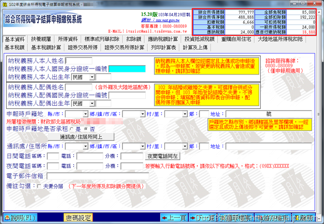 基本上依著頁籤順序(基本資料→扶養親屬…)每頁都看完,最後就可以計算及上傳進入繳費階段,這部份就不細說,若操作使用上有任何問題,可使用國稅局的免付費專線 0800-080089,服務時間:5/1~5/31 8:00~22:00、6/1~6/3 8:00~24:00。