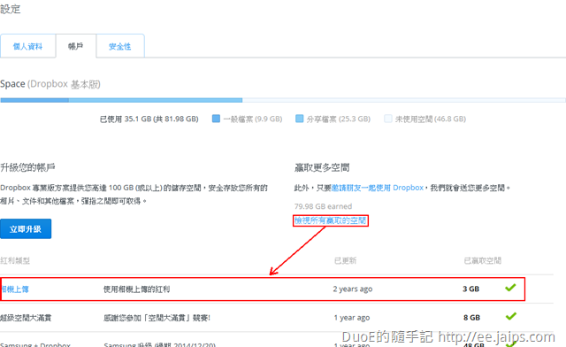 Carousel 3G Bug 不確定官方未來會不會修正,目前測試發現確實會造成 Carousel 新的 3G 獎勵拿不到,且先前舊的 Camera Upload Bonus 未拿滿 3G 者,也不會再有空間增加,所以請先確認未領取過相機上傳獎勵:https://www.dropbox.com/account#personal