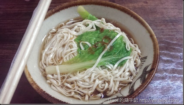 接著,麵上桌了。雖然是乾麵,但有加了一點湯,大概是怕太乾不好拌,不過這樣湯量又不會覺得太濕。麵條是有點像關廟麵的細扁麵,跟市區裡的竹山意麵有點像,是我很喜歡的麵條,沒有肉燥,只有油蔥,所以整碗麵飄著濃濃的豬油香,但是不油膩,雖然泡著湯,但麵條一點也不糊爛,這口感就比竹山意麵好許多。