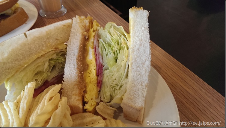 最後送上桌的是這次優惠內容的主餐:大口咬花生培根歐姆蛋,兩大片的厚片土司,塗上香濃的花生醬,夾了一大疊的生菜和厚厚的歐姆蛋,當然還有培根,很有誠意的厚度,看著它不知道該從哪下口。