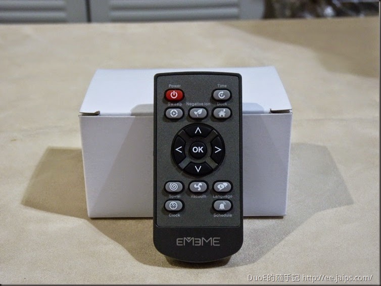 它還有一個更懶人的配件,隨機附有一個遙控器,不管是躺著、坐著就能一鍵操控這台掃地機,另外掃地機還有更多的功能也需要靠這隻遙控器來設定,加上最近家中配備了 Broadlink RM 系列雲端遙控,所以對於有遙控器的家電總會多看個兩眼。