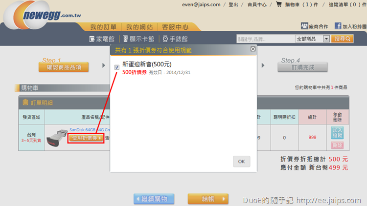 按下[使用折價券]按鈕,勾選這次活動的新蛋迎新會(500元)折價券,結帳金額就馬上折抵500元,也就是這隻 SanDisk CZ43 64GB USB3.0 隨身碟,從999元變成499元,整整五折價還享免運費、可刷卡、分期的優惠。