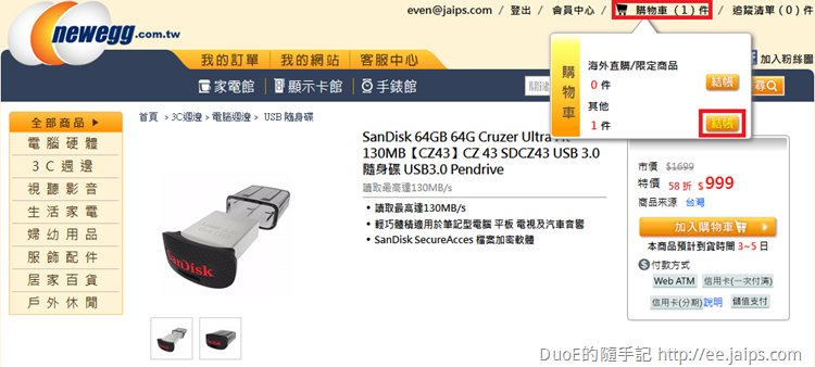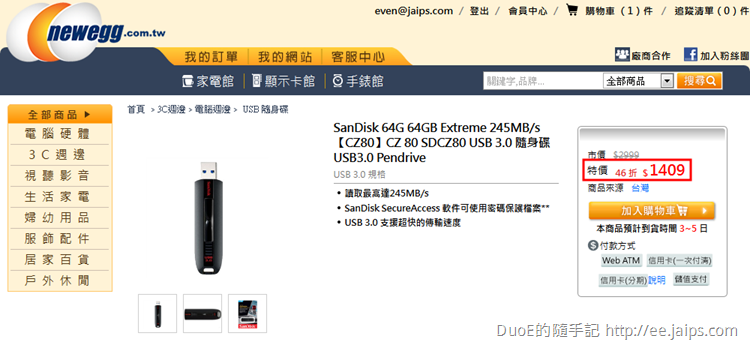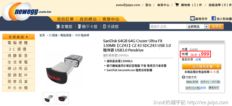 接著就可以開始逛商城挑選喜歡的商品,比較推薦特價的商品,雖然市價欄的數字不太能反應真實狀況,但以這款剛好達到折抵門檻999的 SanDisk CZ43 64GB USB3.0 隨身碟來看,目前購物網價格都訂在1088,新蛋特價999已相對低價,現折500後499的價格網拍都沒得比!更何況新蛋還含運可刷卡、分期。