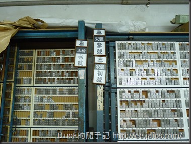 一進門就看見一排排的字架,字架間的走道大概只能容納兩個人側肩錯身,所以導覽老師在門口就千叮嚀萬交代,小心身上的背包不要撞到字架上的鉛字,萬一真的不小心撞掉鉛字是不能直接撿起來放回架上的。為了安全起見,還是讓同學們把包包放在門口右側的置物櫃上。